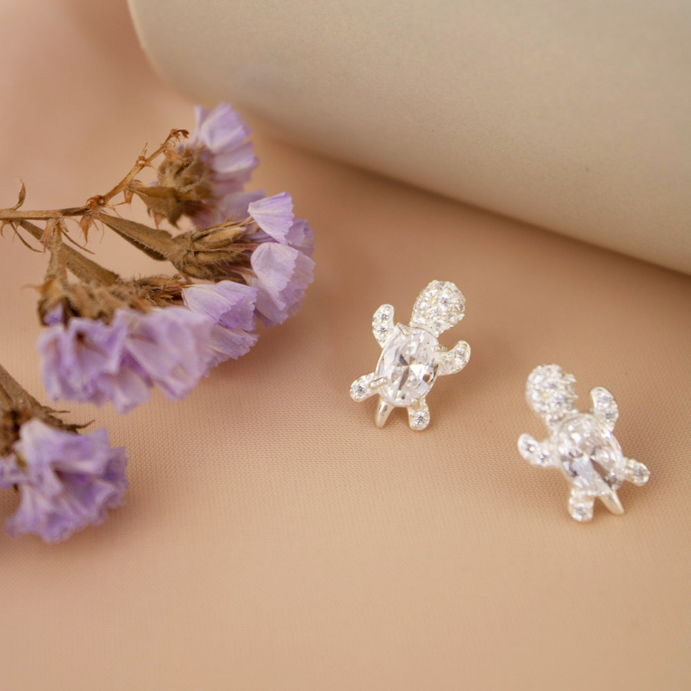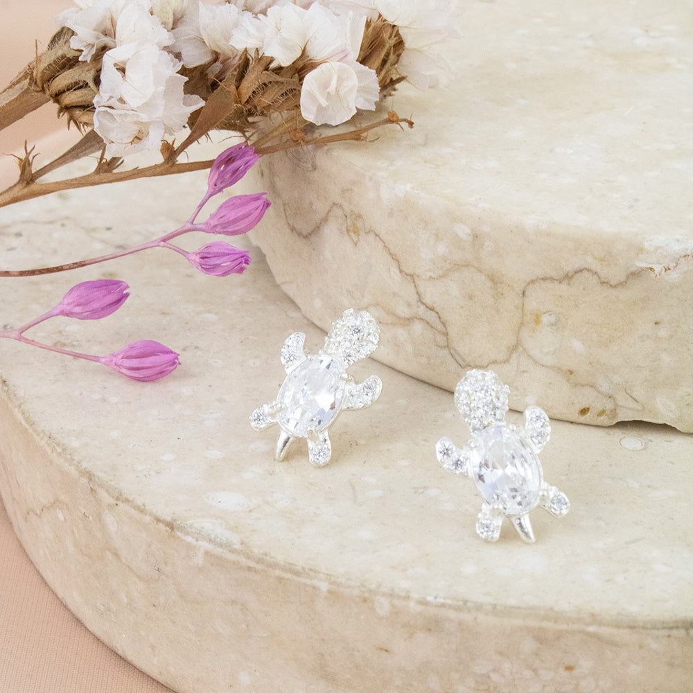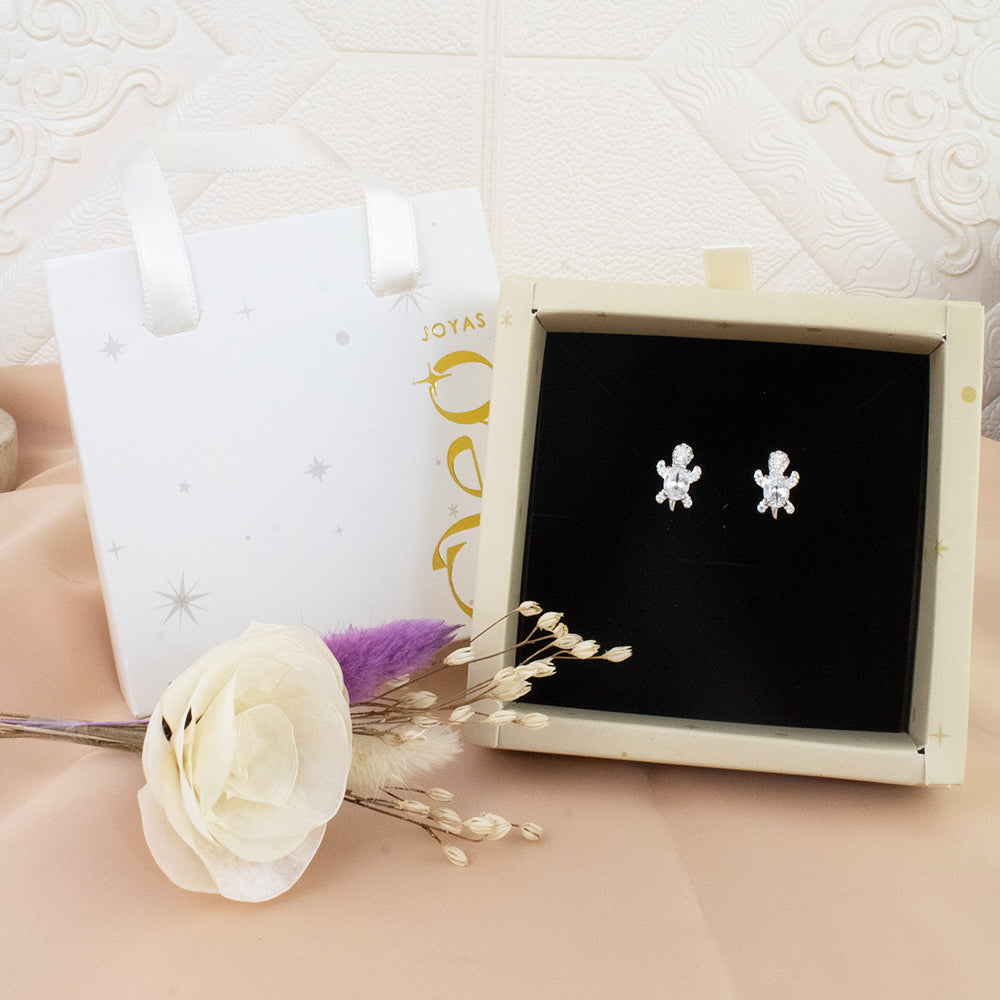 Nuestros hermosos aretes de tortuga de Plata 925 con circones suizos en tono cristal tienen un diseño versátil y atemporal, perfecto para realzar tu estilo diario con un toque de diversión. Sumérgete en esta tendencia, elaboradas con finos metales que garantizan ser hipoalergénicos e inoxidables, esta pieza es elaborada en plata 925.