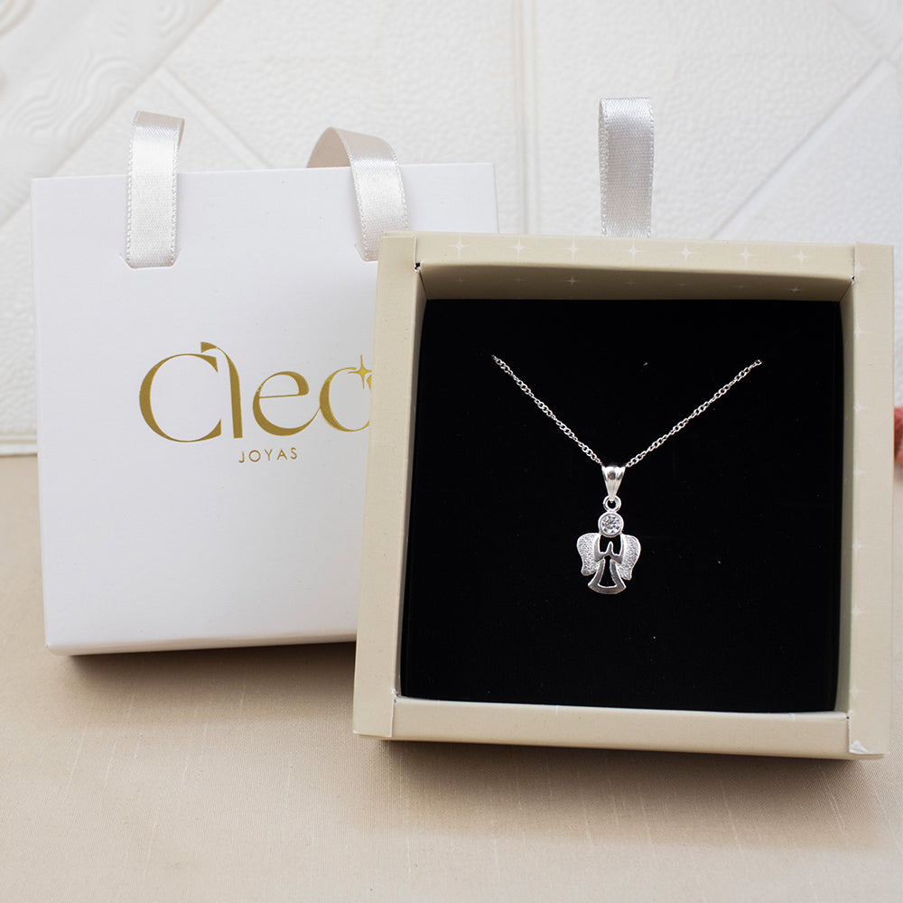 Elegante collar con dije de ángel calado en Plata 925, con cadena de 45 cm. Su diseño minimalista y atemporal lo hace perfecto para cualquier ocasión, simbolizando fe y estilo con un toque sofisticado. Ideal para uso diario o looks formales.