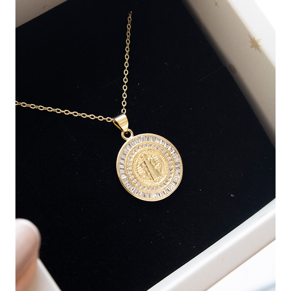 Elegante y delicado diseño de San Benito con circonias suizas. Te protegerá a donde vayas, simboliza la protección de males, peligros y tentaciones. Su acabado pulido y minimalista lo convierte en una pieza moderna y versátil, ideal para el uso diario.