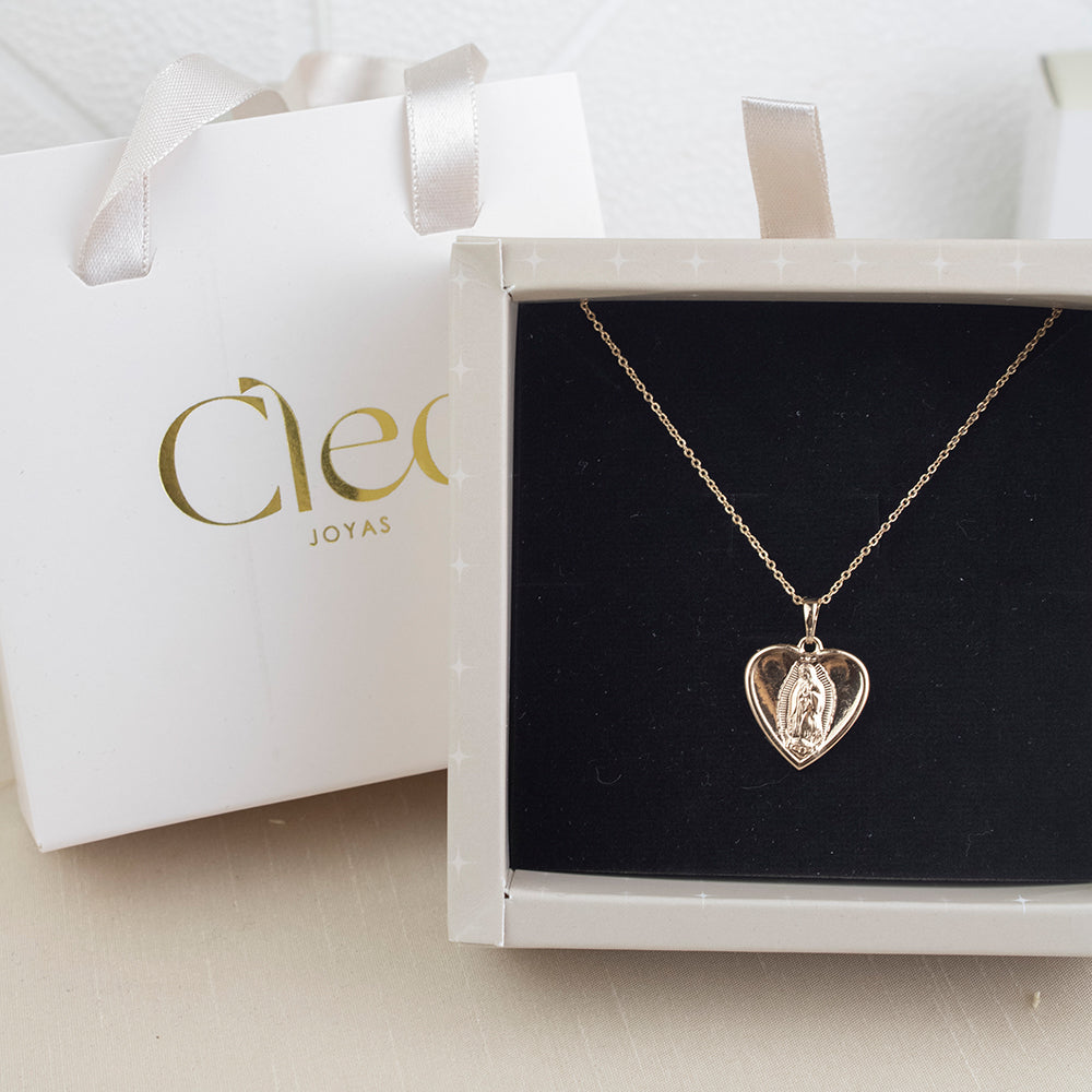 Elegante y delicado dije de corazón con diseño de Virgen de Guadalupe en enchape de oro rosa, viene acompañado de un dije de corazón. Su acabado pulido y minimalista lo convierte en una pieza moderna y versátil, ideal para el uso diario.