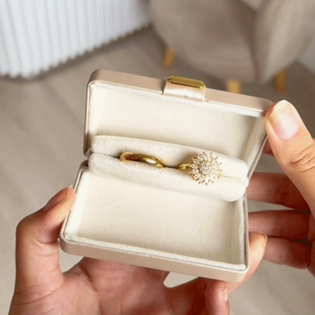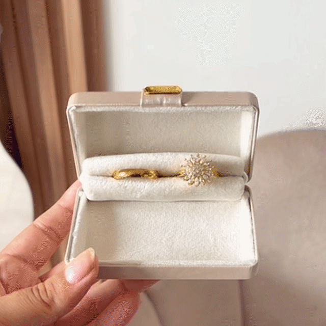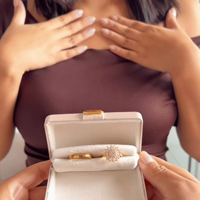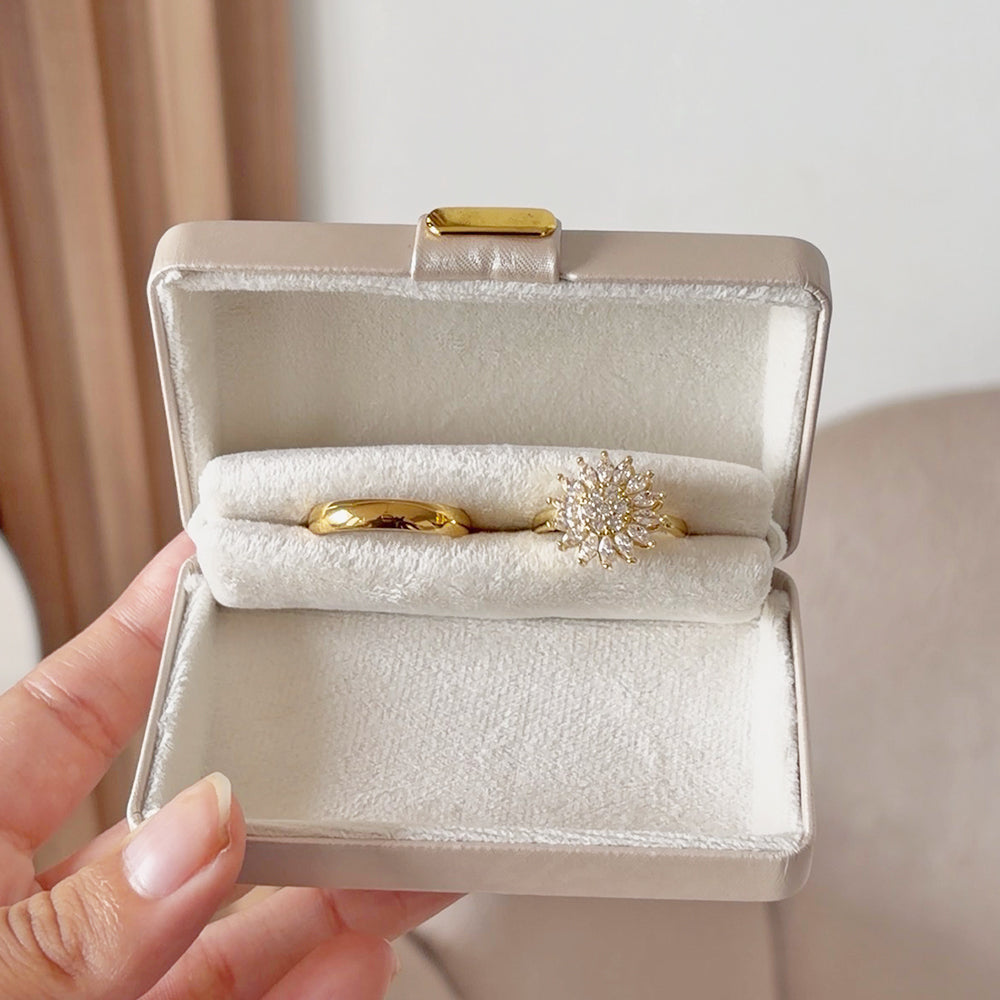 Nuestro Box Premium de Anillos de Promesa de Girasol Dorado contiene: